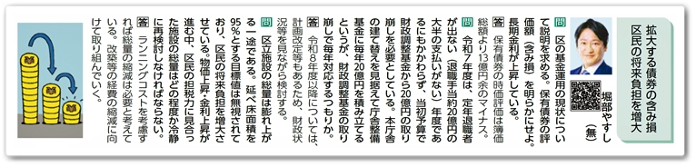 | [問]区の基金運用の現状について説明を求める。保有債券の評価額(含み損)を明らかにせよ。長期金利が上昇している。 |