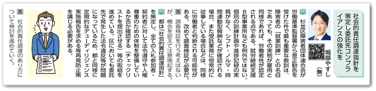 [問]都は「社会的責任調達指針」を策定し、全ての入札参加者・契約者に対して法令遵守や人権尊重のための体制を整備しているか否か確認する(チェックリストを提出させる)等の取組を進めている。区においても委託先で発生した法令違反等が問題になっているため、都と同様に定期的なデューディリジェンス実施報告を求める等再発防止策を講じる必要がある。