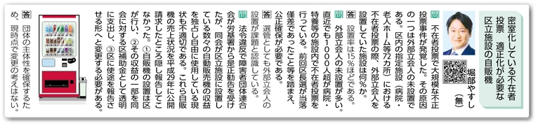 [問]法令違反で障害者団体連合会が労基署から是正勧告を受けたが、同会が区立施設に設置している数々の自動販売機の収益を独占し自由に使用している現状も不適切である。これら自販機の売上状況を平成29年に公開請求したところ隠し報告してこなかった。①自販機の設置は区が行い、②その収益の一部を同会に対する区補助金として透明に支出し、③区に使途を報告させる形へと変更する必要がある。